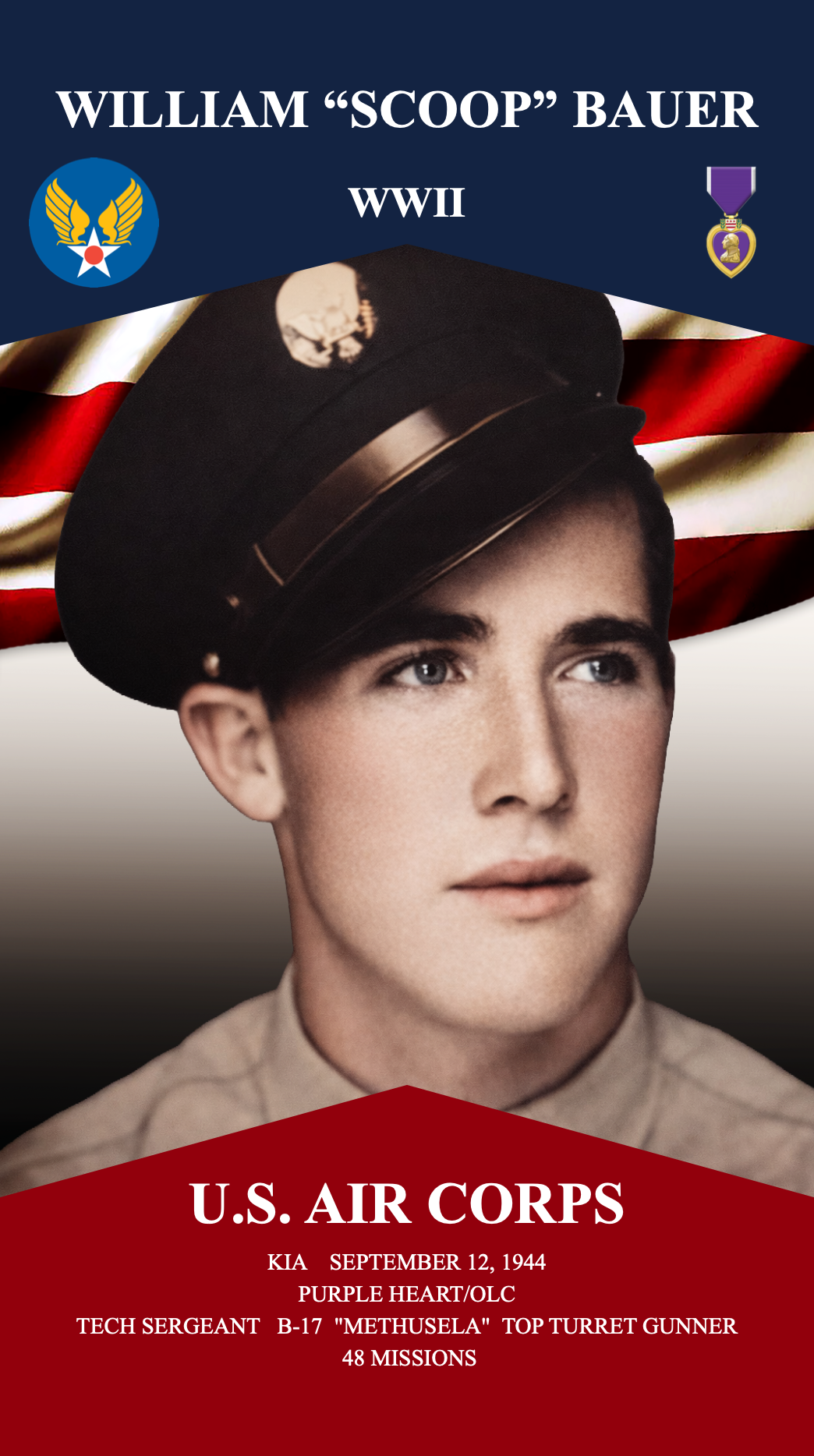 Served: 1942-1944 KIA September 12, 1944 Purple Heart/OLC Tech Sergeant B-17 “Methusela” Top Turret Gunner 48 Missions