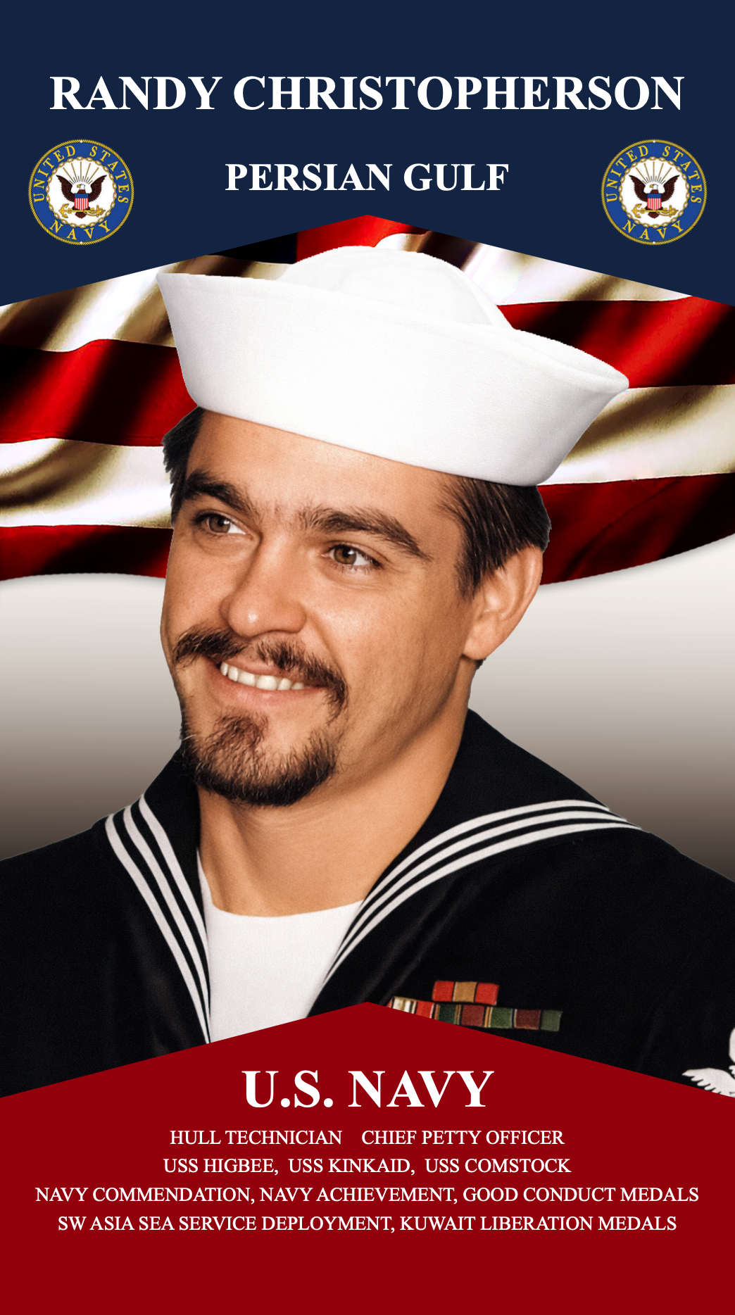 Served: 1978-1998 Hull Technician Cheif Petty Officer USS Higbee, USS Kinkaid, USS Comstock Navy Commendation, Navy Acheievement, Good Conduct Medals SW Asia Sea Service Deployment, Kuwait Liberation Medals