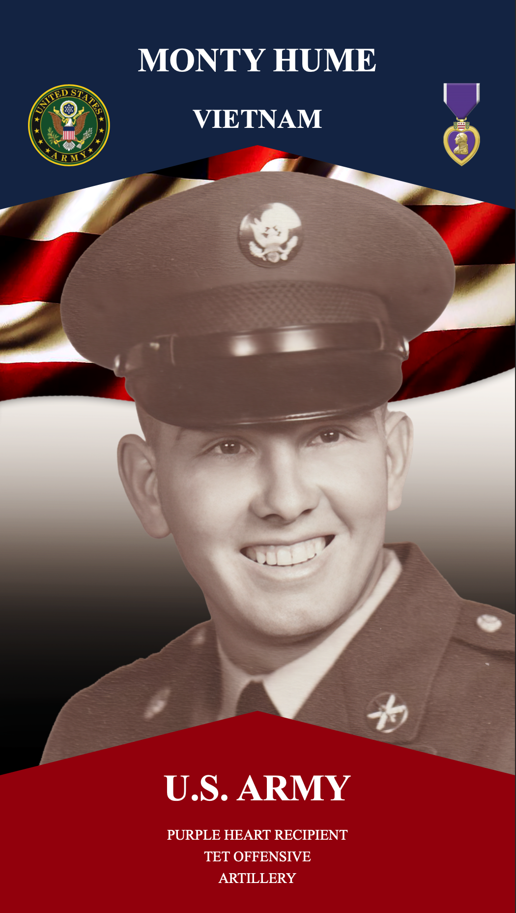 COMBAT WOUNDED, PURPLE HEART RECIPIENT – FOUGHT IN TET OFFENSIVE OCT 1968 – MEMBER OF 105 ARTILLERY BATTERY
